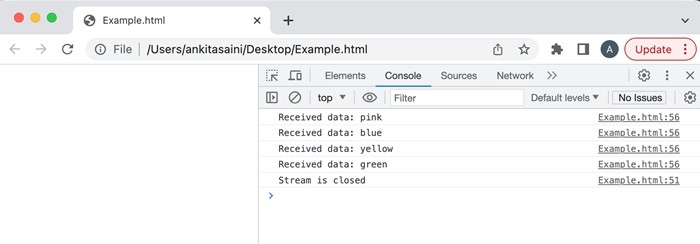 在下面的程序中,我们将使用 ReadableStream 构造函数创建自定义可读流。因此,首先我们创建一个以块形式生成数据的函数。然后,我们使用包含 start() 函数的 ReadableStream() 构造函数创建一个可读流。此 start() 函数使用 pData() 递归函数,该函数在控制器的帮助下将数据从 myData() 函数推送给使用者,其中每个推送操作之间的超时设置为 1 秒。现在,我们创建一个读取器,以使用 getReader() 函数使用流中的数据。然后,我们创建一个 readMyData() 函数,在读取器的帮助下递归地从流中读取数据。当流结束时,done 标志被设置为 true,我们退出递归 圈。
