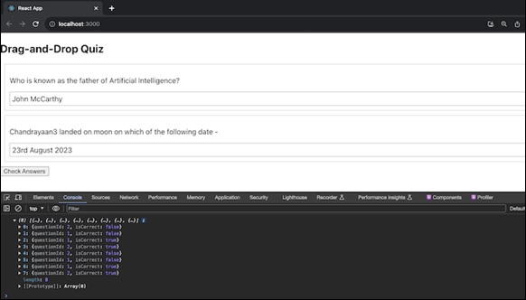 此示例设置了一个测验,用户可以在其中拖放正确答案选项以将它们与相应的问题匹配。当单击“检查答案”按钮时,该应用程序会提供有关用户答案正确性的反馈。我们可以根据我们的特定测验要求进一步定制此应用程序。
