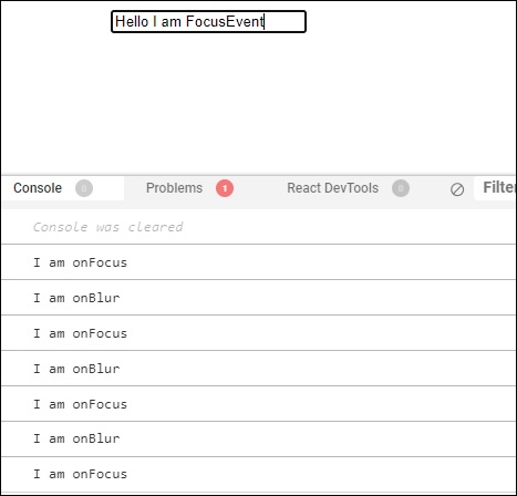 onBlur={(e) => console.log(“我是 onBlur”)} − 同样,当我们从输入字段点击或“模糊”时,它将向控制台显示消息“我是 onBlur”。