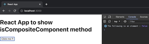 此应用程序具有一个名为 ClassComponent 的简单类组件。主 App 组件呈现一个按钮,当单击该按钮时,将使用 isCompositeComponent() 方法检查 ClassComponent 是否为复合组件。